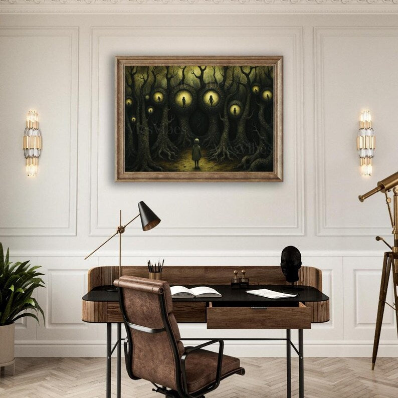 Add a touch of gothic fantasy to your walls with this stunning surreal painting of glowing figures in a dark forest. This moody artwork evokes mystery and intrigue, perfect for lovers of eerie landscapes, dark academia decor, and gothic aesthetics. Available as a framed print, canvas, or poster, this piece brings a haunting yet mesmerizing atmosphere to any room.