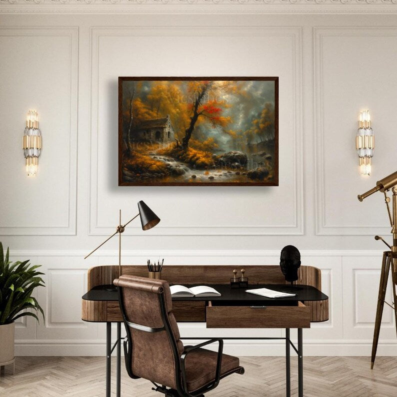 Bring the warmth and beauty of autumn into your home with this stunning wall art featuring a rustic house by a flowing stream amidst vibrant orange and yellow trees. Available as a high-quality poster, canvas, or framed print, this fall landscape evokes a sense of coziness and tranquility. Perfect for adding a touch of rustic charm to any room, this art piece is ideal for autumn lovers and nature enthusiasts alike.