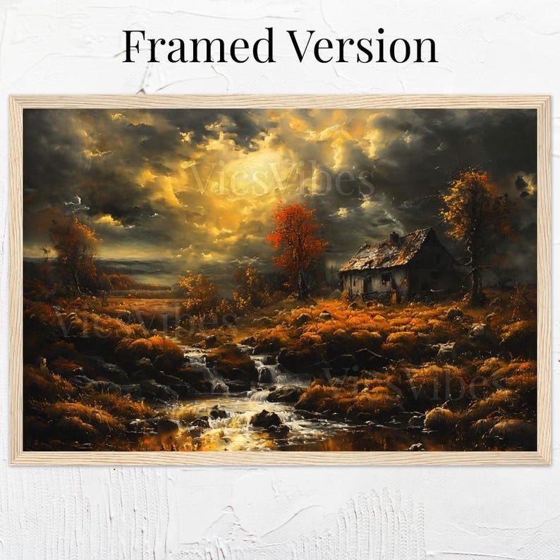 Transform your space with this beautiful autumn wall art, featuring a rustic house by a flowing stream, surrounded by vibrant orange and yellow trees. The dramatic, moody sky adds depth and atmosphere, making this artwork perfect for creating a cozy and inviting vibe in any room. Available as a poster, canvas, or framed print, this piece will bring the warmth of autumn into your home.