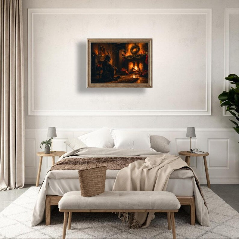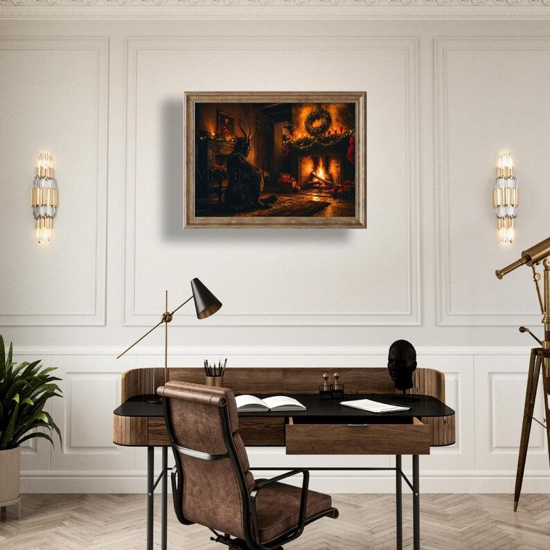 Bring a unique holiday touch to your home with this Krampus-inspired wall art. The cozy yet haunting scene of Krampus sitting by a warm fire, surrounded by holiday decor, creates a perfect winter ambiance. Available as a poster, canvas, or framed print, this piece is an ideal addition to holiday decor or as a statement piece for those who enjoy a darker side of Christmas. This artwork captures the warm glow of a rustic cabin and the mysterious allure of Krampus, adding charm and intrigue to any space.