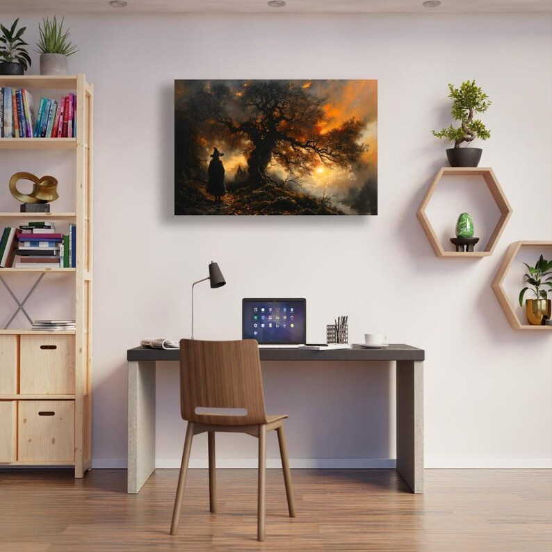 Add a touch of dark fantasy to your home with this captivating wall art featuring a witch in a spooky landscape. Set against a glowing sunset or moon, the twisted tree and eerie atmosphere bring a gothic charm to this unique artwork. Available as a poster, canvas, or framed print, this piece is perfect for Halloween or for those who love a dark and mysterious aesthetic in their decor.
